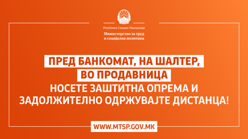 Министерството за труд и социјална политика апелира до пензионерите да се придржуваат до распоредот за исплата на пензиите на шалтерите на банките. Само со одговорно однесување на секој пензионер може да го заштитиме личното и јавното здравје. Почитувањето на препораките за носење лична заштитна опрема на лицето и држење растојание од најмалку два метра додека чекате во ред пред или внатре во банките, е во интерес на сите нас.