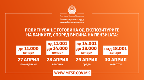 Ministria e Punës dhe Politikës Sociale rikujton se nga dita e hënë fillon të bëhet pagesa e pensioneve sipas lartësisë së pensionit në sportelet e bankave, edhe atë: për pensionet deri 11.000 denarë, pagesa bëhet ditën e hënë 27 prill, për pensionet prej 11.001-14.000 denarë, pagesa bëhet ditën e martë më 28 prill, për pensionet prej 14.001-18.000 denarë, pagesa bëhet të mërkurën më 29 prill dhe për pensionet më të larta se 18.001 denarë, pagesa bëhet të enjten më 30 prill.