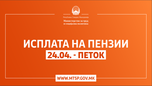 Министерството за труд и социјална политика информира дека пензискиот систем е стабилен и функционира без проблеми. И во услови на здравствено-економска криза од глобални размери, исплатата на априлската пензија ќе почне една недела пред први мај. Над 320 илјади пензионери ќе ги имаат пензиите на своите сметки од петок, 24-ти април.