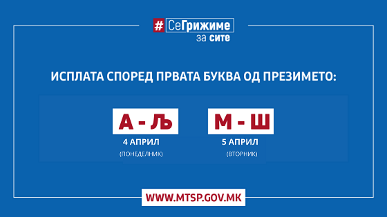 Со цел да се избегне метеж пред банките и да се овозможи поголема заштита на корисниците на парична помош во услови на опасност од вирусот КОВИД-19, за корисниците кои не користат картички, исплатата ќе се спроведе во 2 групи во сите отворени филијали и експозитури на банките, согласно со утврдениот распоред по азбучен ред, според првата буква од презимето и тоа: