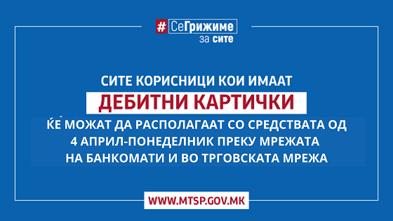 Корисниците на парични права коишто поседуваат дебитна картичка ќе можат да подигнат готовина на банкоматите на банките, да ги користат средствата за безготовински плаќања во продажната мрежа или преку електронско и мобилно банкарство од денеска, 4 април 2022 година.