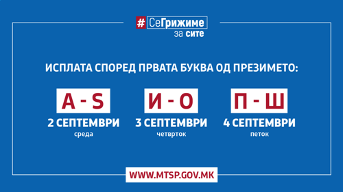 Министерството за труд и социјална политика информира дека од денеска, 2 септември 2020 година (среда) започнува исплатата на правата од социјална и детска заштита за месец август 2020 година: