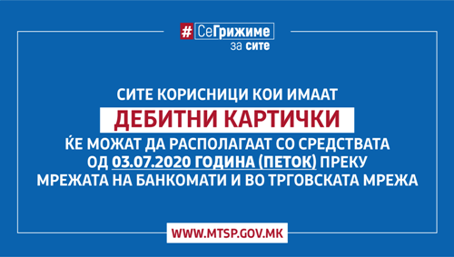 Корисниците кои имаат дебитна картичка поврзана со трансакциската сметка на која се исплаќаат правата од социјална и детска заштита, ќе можат паричните средства да ги подигнат на банкоматите на банките, да ги користат за безготовински плаќања во продажната мрежа или преку електронско и мобилно банкарство, од денеска, петок, 3 јули.