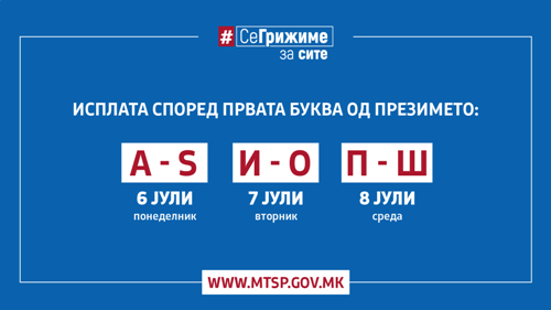 Исплатата ќе се спроведе во 3 групи во сите отворени филијали и експозитури на банките, согласно со утврдениот распоред по азбучен ред, според првата буква од презимето:
