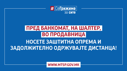 Ministria e Punës dhe Politikës Sociale i rikujton shfrytëzuesit për obligimin e mbajtjes së mbrojtjes personale për të parandaluar përhapjen e virusit korona. Të gjithë ata që do të tërheqin të holla nga bankomatet ose filialet dhe ekspoziturat e bankave janë të obliguar të mbajnë maska mbrojtëse për të mbuluar fytyrën dhe të mbajnë distancën fizike prej 2 metrave.