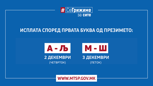 Министерството за труд и социјална политика информира дека денеска започна исплатата на правата од социјална, детска и цивилна заштита за месец ноември 2021 година.