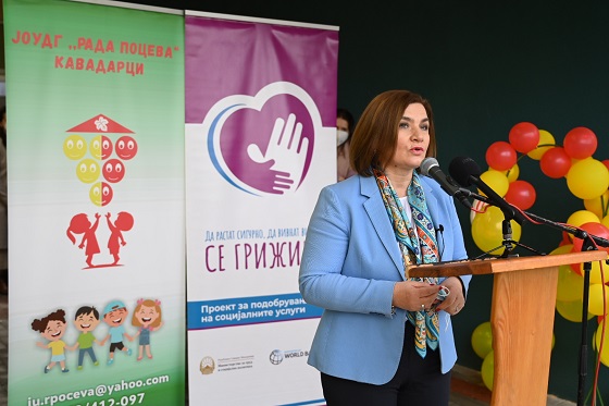 „Децата од Кавадарци за првпат после 40 години, добиваат целосно нова детска градинка којашто целосно е финансирана од Министерството за труд и социјална политика, во склоп на Проектот за подобрување на социјалните услуги, поддржан од Светска банка, во вредност од 57.4 милиони денари. Таа е изградена согласно најсовремените стандарди за енергетска ефикасност и ќе користи и обновливи извори на енергија преку системот на сончеви колектори. Изминатиот период Владата и Министерството посветено работеа на остварување на социјалната реформа која всушност значи влог во човечкиот капитал, кој е најдолгорочната и најзначајната инвестиција на секоја Влада,“рече Шахпаска.