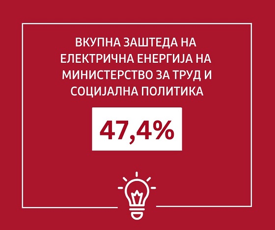 Министерството за труд и социјална политика во октомври 2022 година, со примена на мерките за заштеда на електрична енергија, евидентира помала потрошувачка од 47.4% во споредба со потрошувачката на електрична енергија истиот месец претходната година.