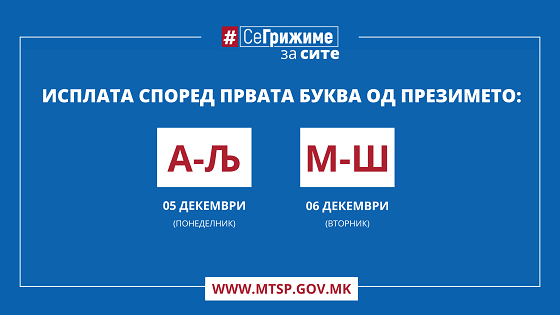 Министерството за труд и социјална политика информира дека денеска започна исплатата на правата од социјална, детска и цивилна заштита за месец ноември 2022 година.