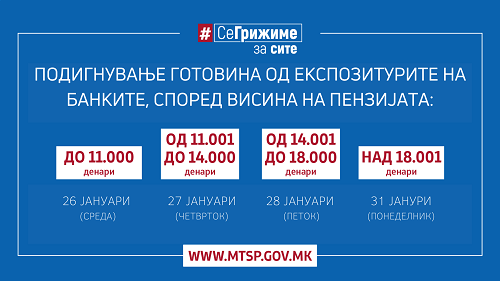 - За пензии со висина 14.001-18.000 денари, исплатата да се изврши на 28.01.2022 година (петок) и
