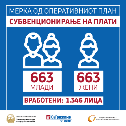 Mbështetja financiare është dizajnuar në atë mënyrë që nxitë punësimin e të rinjve dhe bën përpjekje që të arrihet përfaqësim i drejt gjinor. Me këto dy shpallje është mbështetur punësimi i 663 vetave deri në moshën 29 vjeçare dhe i 663 grave. Ndihma financiare për vendet e reja të hapura të punës deri më tani arrin 302.556.000 denarë.