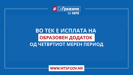 Министерството за труд и социјална политика ги информира граѓаните дека во тек е исплатата на образовниот додаток за четвртиот мерен период.