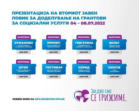 Со јавна презентација пред општините од Североисточниот плански регион во Куманово започна караванот за презентирање на вториот јавен повик за доделување грантови за развој на социјални услуги на локално ниво, што го организира Министерството за труд и социјална политика. Преку караванот општините, невладините и граѓанските организации ќе бидат запознаени со роковите, постапката за аплицирање и условите на јавниот повик. Целта на презентациите што во текот на оваа седмица ќе се одржат во сите осум плански региони во државата е општините и организациите да се мотивираат да аплицираат на повикот и да предложат што поквалитетни проекти за социјални услуги на локално ниво. Општините ќе бидат носители на идните проекти за социјални услуги во своите средини, заедно со локални граѓански и невладини организации како даватели на услугите.