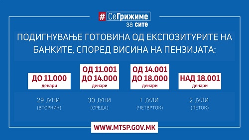 За пензии со висина над 18.001 денари, исплата да се изврши на 02.07.2021 година (петок).