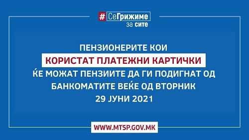 Пензионерите кои користат платежна картичка, поврзана со сметката на која се префрлува пензијата, со парите можат да располагаат од 29 јуни (вторник). Тие можат да ја подигнат пензијата на банкомат, да ги користат средствата за плаќање во трговската мрежа или за електронски плаќања.