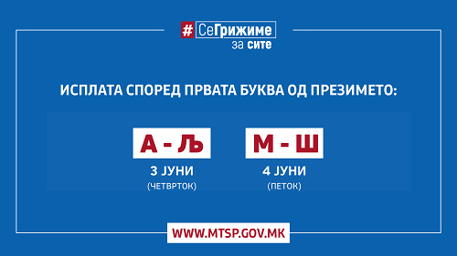Со цел да се избегне метеж пред банките и да се овозможи поголема заштита на корисниците на парична помош во услови на опасност од вирусот КОВИД-19,за корисниците кои не користат картички, исплатата ќе се спроведе во 2 групи во сите отворени филијали и експозитури на банките, согласно со утврдениот распоред по азбучен ред, според првата буква од презимето и тоа: