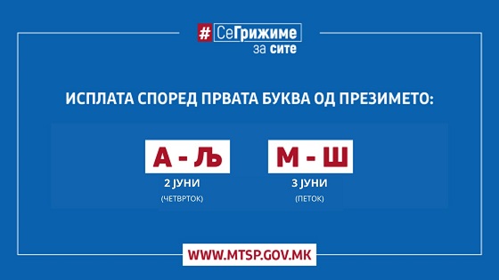 Со цел да се избегне метеж пред и во банките при исплата на правата, за корисниците кои не користат картички, исплатата ќе се спроведе во 2 групи во сите отворени филијали и експозитури на банките, согласно со утврдениот распоред по азбучен ред, според првата буква од презимето и тоа: