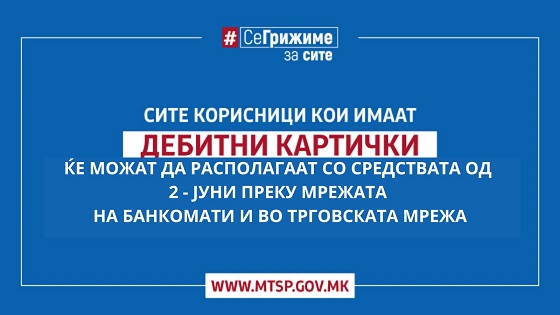 Корисниците на парични права коишто поседуваат дебитна картичка ќе можат да подигнат готовина на банкоматите на банките, да ги користат средствата за безготовински плаќања во продажната мрежа или преку електронско и мобилно банкарство од денеска, 2 јуни 2022 година.