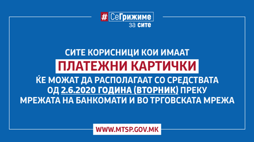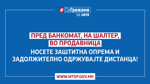 Министерството за труд и социјална политика потсетува на обврската за носење лична заштита заради спречување на ширење на коронавирусот. Сите кои ќе подигнуваат пари од банкомати или од филијалите и експозитурите на банките, се должни да носат каква било форма на заштита којашто ги покрива носот и устата и да одржуваат физичко растојание од два метра.