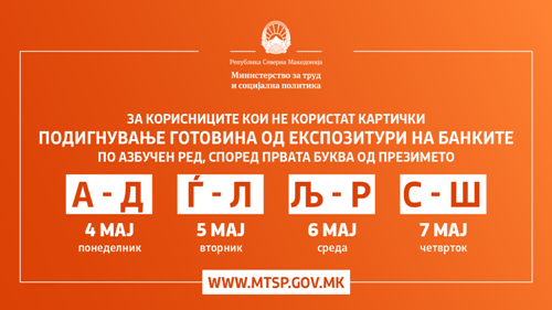 Министерството за труд и социјална политика ги известува корисниците на права на парична помош од социјална и детска заштита дека почнувајќи од понеделник (04 мај) ќе се врши етапна исплата на паричната помош на шалтерите на банките, по дефиниран редослед по азбучен ред според почетната буква од презимето и тоа: