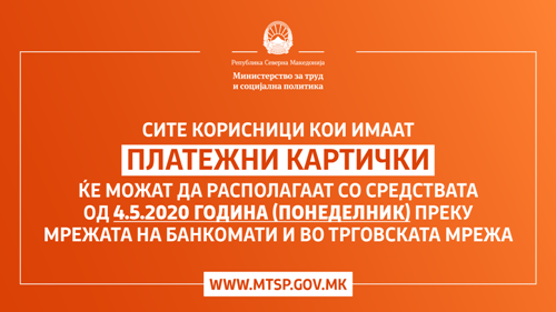 Министерството за труд и социјална политика укажува дека корисниците кои користат платежни картички поврзани со трансакциската сметка на која се исплаќаат правата од социјална и детска заштита, ќе можат паричните средства да ги подигнат на банкоматите на банките, да ги користат за безготовински плаќања во продажната мрежа или преку електронско и мобилно банкарство, сметано од 04.05.2020 година.