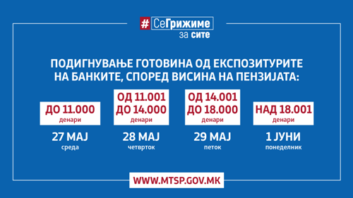 - Во среда, на 27.05.2020 година исплата на пензии со висина до 11.000 денари;