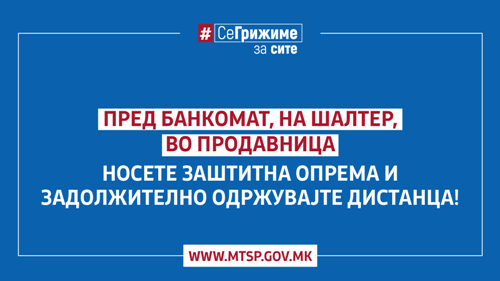 Со етапната исплата на пензиите овозможуваме поголема заштита на пензионерите во услови на опасност од коронавирусот КОВИД-19. Апелираме до пензионерите да се придржуваат до распоредот за исплати, да носат лична заштитна опрема којашто ги покрива устата и носот како и да држат растојание од најмалку два метра при чекање ред пред и внатре во банките.