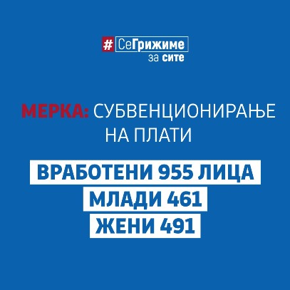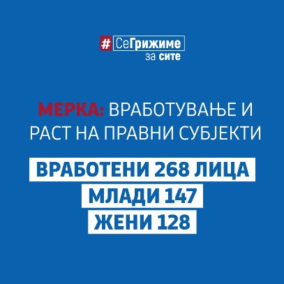 Sot kryhet pagesa e parë në vlerë prej 28.5 milionë denarë për kontratat tashmë të lidhura për masën “Punësim dhe rritje e subjekteve juridike”. Deri më tani, për këtë masë, janë nënshkruar kontrata me 186 kompani, kurse grantin e marrin për furnizim të pajisjes së re ose repromaterialeve. Ndër punësimet e reja 128 janë të gjinisë femërore, kurse struktura e vendeve të punës po tregon se 147 persona janë të moshës deri 29 vjeç dhe për to kompanitë marrin mjete të pakthyeshme nga 153,750 denarë për person. Një kompani mund të aplikojë për mbështetje deri në 5 punësime. Obligim i kompanisë është që të rinjtë t’i mbajë në punë së paku një vit.