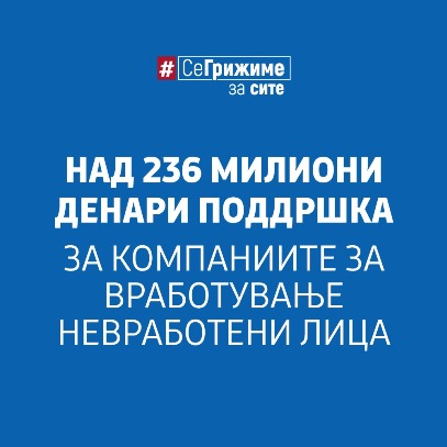 Masat aktive për punësim hapin vende pune edhe në kushte të krizës shëndetësore – ekonomike, e shkaktuar nga COVID-19. Me ndihmë financiare për punësimin e personave të papunë në vlerë mbi 236 milionë denarë, janë mbështetur 1.223 vende të reja pune. Plani operativ i punësimit edhe në këto kushte jashtëzakonisht të vështira, dëshmon të jetë një kornizë funksionale për hapjen e vendeve të reja të punës, i cili e zbutë me sukses krizën dhe e lehtëson rimëkëmbjen e ekonomisë.