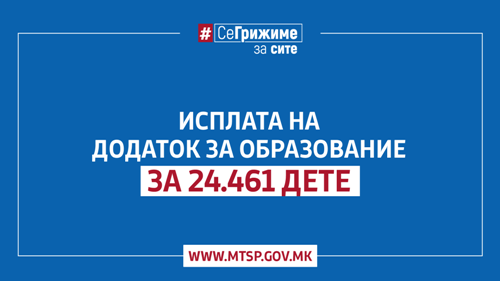 Министерството за труд и социјална политика информира дека е извршена исплата на додатокот за образование, за третиот мерен период, за 24.461 дете.