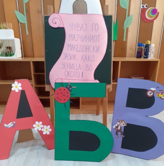 Се реализираа воспитно-образовни активности според програмата на тема македонскиот јазик, користејќи детска литература, изработки на букви од азбуката, изработка на сликовници, препознавање на одредени букви од азбуката, изработка на пано со букви од македонската азбука користејќи природни материјали, едукативни сложувалки и друг вид на дидактички материјал.