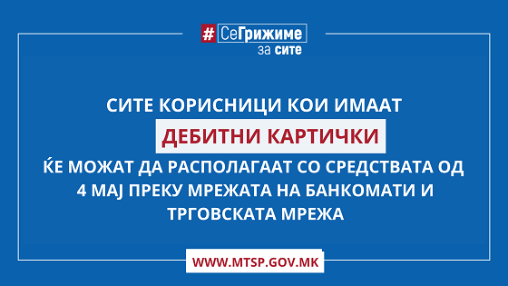 Корисниците на парични права коишто поседуваат дебитна картичка ќе можат да подигнат готовина на банкоматите на банките, да ги користат средствата за безготовински плаќања во продажната мрежа или преку електронско и мобилно банкарство од денеска, 4 мај 2023 година.