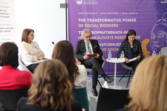 Ministria e Politikës Sociale, Demografisë dhe e të Rinjve, në partneritet me UN Women Maqedoni e Veriut, organizoi panel diskutimi me titull “Fuqia transformuese e punonjëseve sociale” me rastin e shënimit të “8 Marsit” – Ditës Ndërkombëtare të Gruas. Ngjarja, e cila u zhvillua në Qendrën e Ndërmarrjeve Sociale të Ministrisë, mblodhi së bashku politikëbërës, punonjës socialë dhe përfaqësues nga komuniteti akademik për të diskutuar mbi rolin jetik të punonjësve socialë në adresimin e nevojave të grupeve më të cenueshme dhe promovimin e përfshirjes sociale.