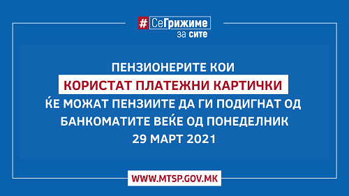 Пензионерите кои користат платежна картичка, поврзана со сметката на која се префрлува пензијата, со парите можат да располагаат од 29 март(понеделник). Тие можат да ја подигнат пензијата на банкомат, да ги користат средствата за плаќање во трговската мрежа или за електронски плаќања.