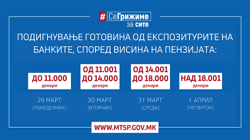 -За пензии со висина 14.001-18.000 денари, исплатата да се изврши на 31.03.2021 година (среда);