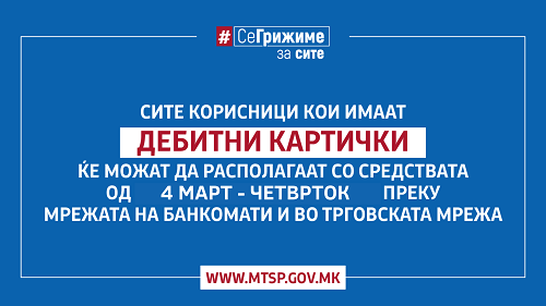 Министерството за труд и социјална политика информира дека од утре 4 март (четврток) 2021 година започнува исплатата на правата од социјална, детска и цивилна заштита (сите парични прaва) за месец февруари 2021 година.