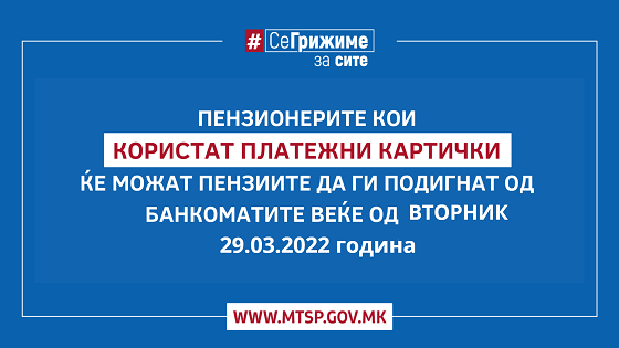 Пензионерите кои користат платежна картичка, поврзана со сметката на која се префрлува пензијата, со парите можат да располагаат од 29 март (вторник). Тие можат да ја подигнат пензијата на банкомат, да ги користат средствата за плаќање во трговската мрежа или за електронски плаќања. Етапното процесирање на пензиите ќе овозможи спроведување на препораките и мерките за спречување и ширење на вирусот, со оглед на тоа што пензионерите како возрасна група се најранливи.