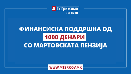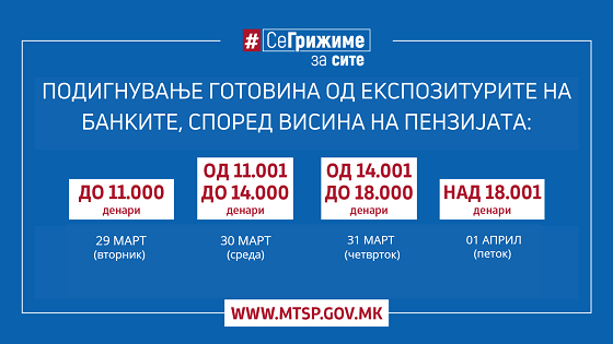 Пензиите ќе бидат исплатени предвреме и етапно, со цел да се овозможи поголема заштита на пензионерите во услови на опасност од Ковид 19. Пензија повисока за 1.000 денари ќе добијат повеќе од 330 илјади пензионери со исплатата на мартовската пензија преку договорената директна финансиска помош која ќе биде исплатена и во месеците април и мај.