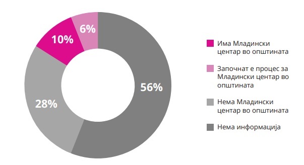 Досега, согласно со одговорите добиени од општините, младински центри има во 8 општини (10% од сите општини), и тоа во следните општини: Гази Баба, Гостивар, Кавадарци, Куманово, Охрид, Свети Николе, Центар, Чаир. Овде важно е да се напомене, дека само 3 од горенаведените општини ги исполнуваат стандардите за квалитет на младинските центри, усвоени од Агенцијата за млади и спорт, а тоа се Општините: Кавадарци, Куманово и Охрид.