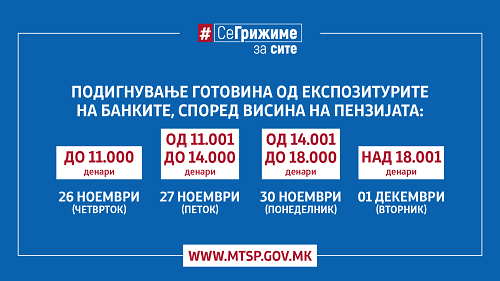 - Во четврток 26.11. 2020 година исплата на пензии со висина до 11.000 денари;