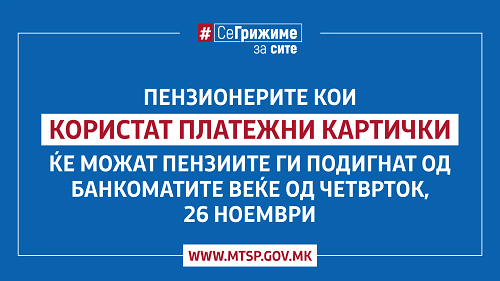 Пензионерите кои користат платежна картичка, поврзана со сметката на која се префрлува пензијата, со парите можат да располагаат од четврток 26 ноември. Тие можат да ја подигнат пензијата на банкомат, да ги користат средствата за плаќање во трговската мрежа или за електронски плаќања.