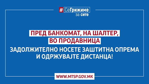 Потсетуваме на обврската за носење лична заштитна опрема којашто ги покрива пределот на носот и устата како и на држење растојание при чекање ред пред и внатре во банките.