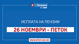 Министерството за труд и социјална политика известува дека од денес 26.11.2021 год. (петок) започнува етапната исплата на ноемвриските пензии. Пензиите ќе бидат исплатени предвреме и етапно, со цел да се овозможи поголема заштита на пензионерите во услови на опасност од коронавирусот КОВИД-19.