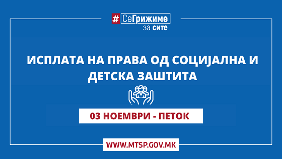Министерството за труд и социјална политика информира дека денеска започна исплатата на правата од социјална, детска и цивилна заштита за месец октомври 2023 година.