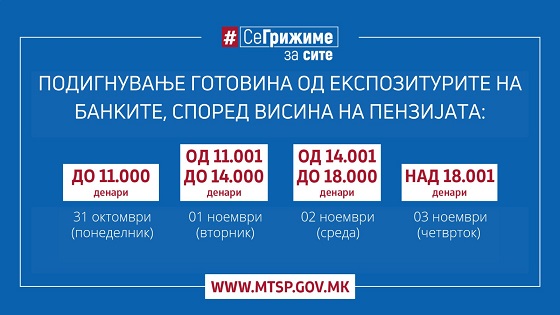 - За пензии со висина 14.001-18.000 денари, исплатата да се изврши на 02.11.2022 година (среда) и