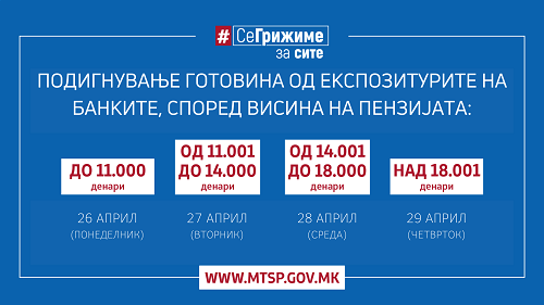 - Të mërkurën, 28.04.2021, do të realizohet pagesa e pensioneve në lartësi prej 14.001 denarë deri 18.000 denarë;