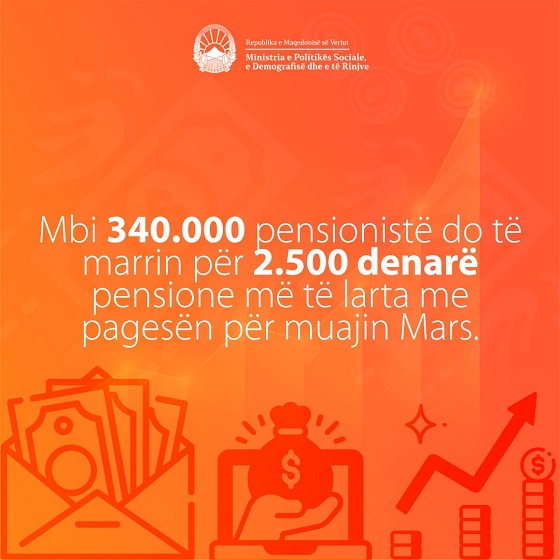 Mbi 340.000 pensionistë në Republikën e Maqedonisë së Veriut nga sot do të marrin pension më të lartë për 2500 denarë. Me rritjen lineare të pensioneve në muajin shtator dhe pensionin e marsit në muajin prill, pensionistët marrin 5000 denarë pension më të lartë për vetëm 9 muaj mandat nga kjo Qeveri.