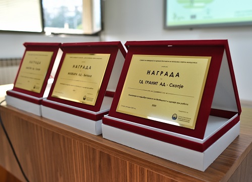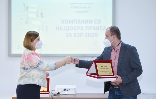 Министерката за труд и социјална политика, Јагода Шахпаска ги додели плакетите на трите најдобро рангирани компании во нашата држава, во рамки на овогодинешниот избор за доделување на Националната награда на компанија со најдобра пракса за безбедност и здравје при работа 2020. Изборот го организира националниот Совет за безбедност и здравје при работа, со поддршка од страна на Министерството за труд и социјална политика.